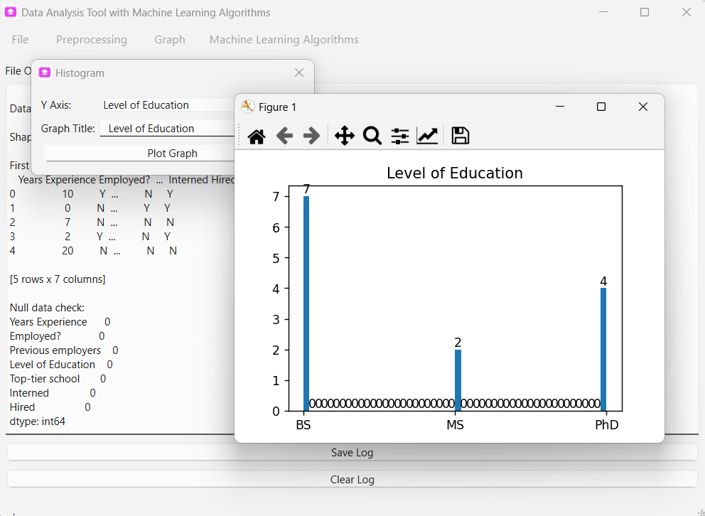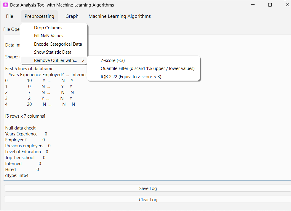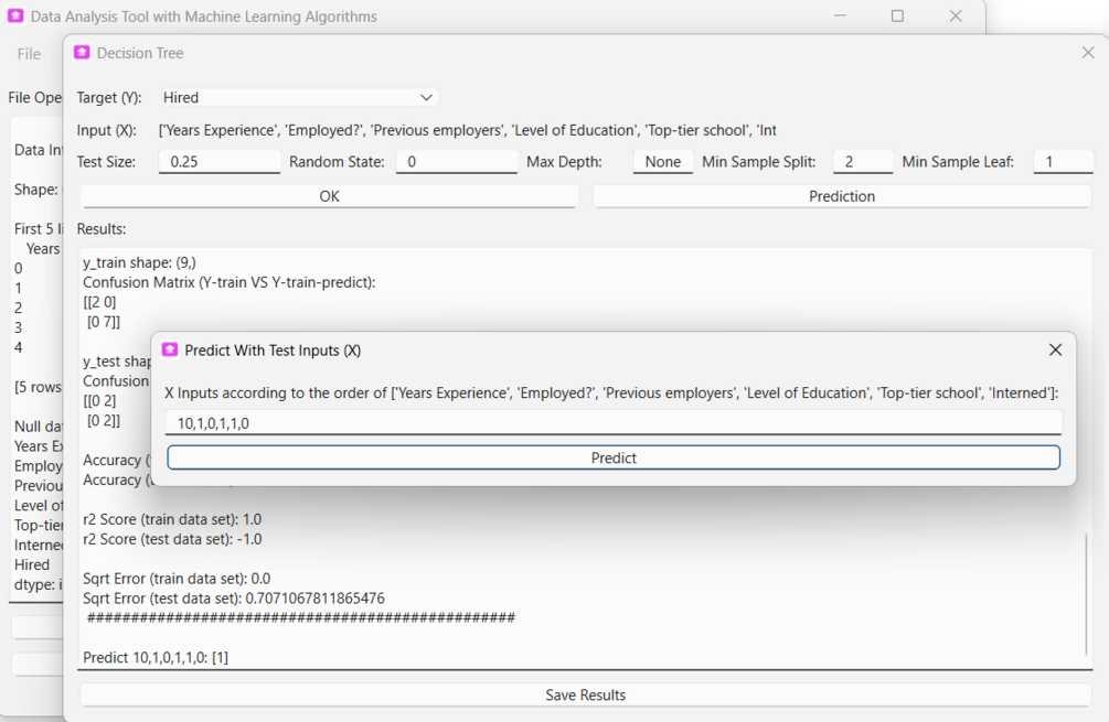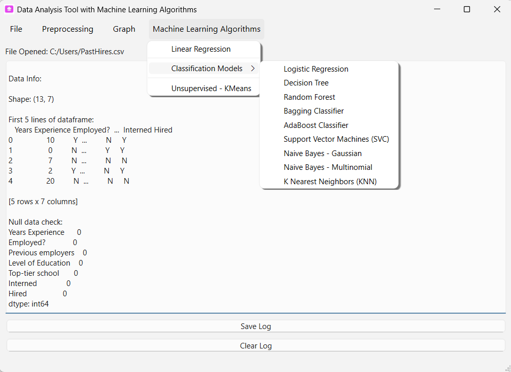 Machine Learning is a subset of Artificial Intelligence (AI) that enable computer to learn from data and make predictions. The tool supporting data analysis with a list of Machine Learning Algorithms. The tool provides simple data pre-processing features and grafts plotting functionalities for user to access the data before analyzing with Machine Learning algorithms.